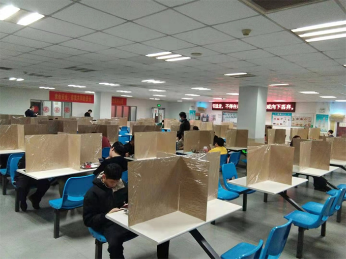 公司总部彩田园区鼓励员工自带午餐、分散进餐,为此紧急采购一批微波炉保障使用;各子公司食堂因地制宜,采取分时段就餐、分区域进餐、独立包装配餐等方式满足员工用餐需求,尽可能减少员工在食堂停留时间。为避免员工就餐聚集,各工厂食堂利用纸板制作“桌面隔离墙”,更进一步确保就餐安全。公司工会系统招募义工为就餐人员喷洒消毒液、引导缓解人流,解决服务人员不足问题。